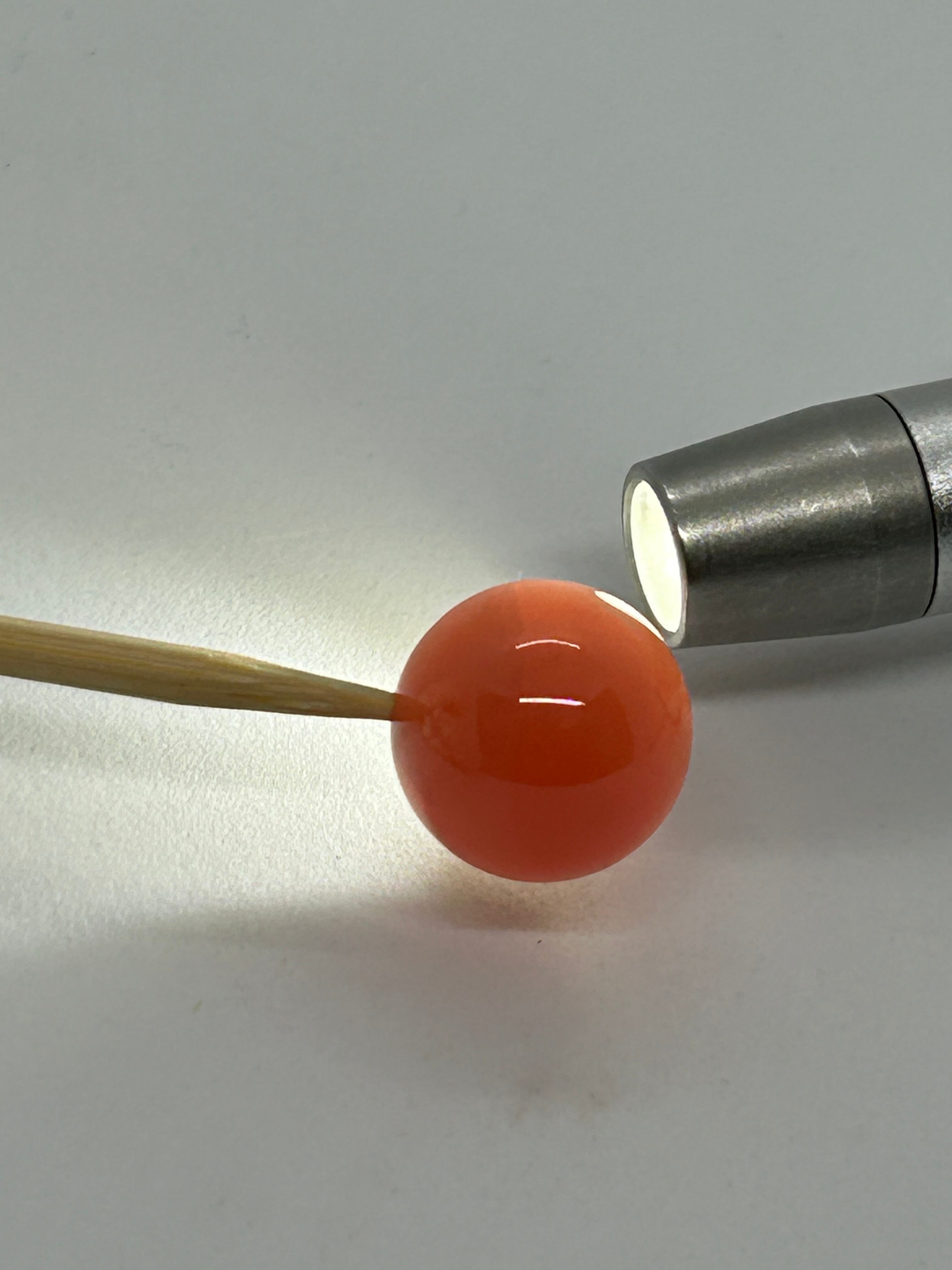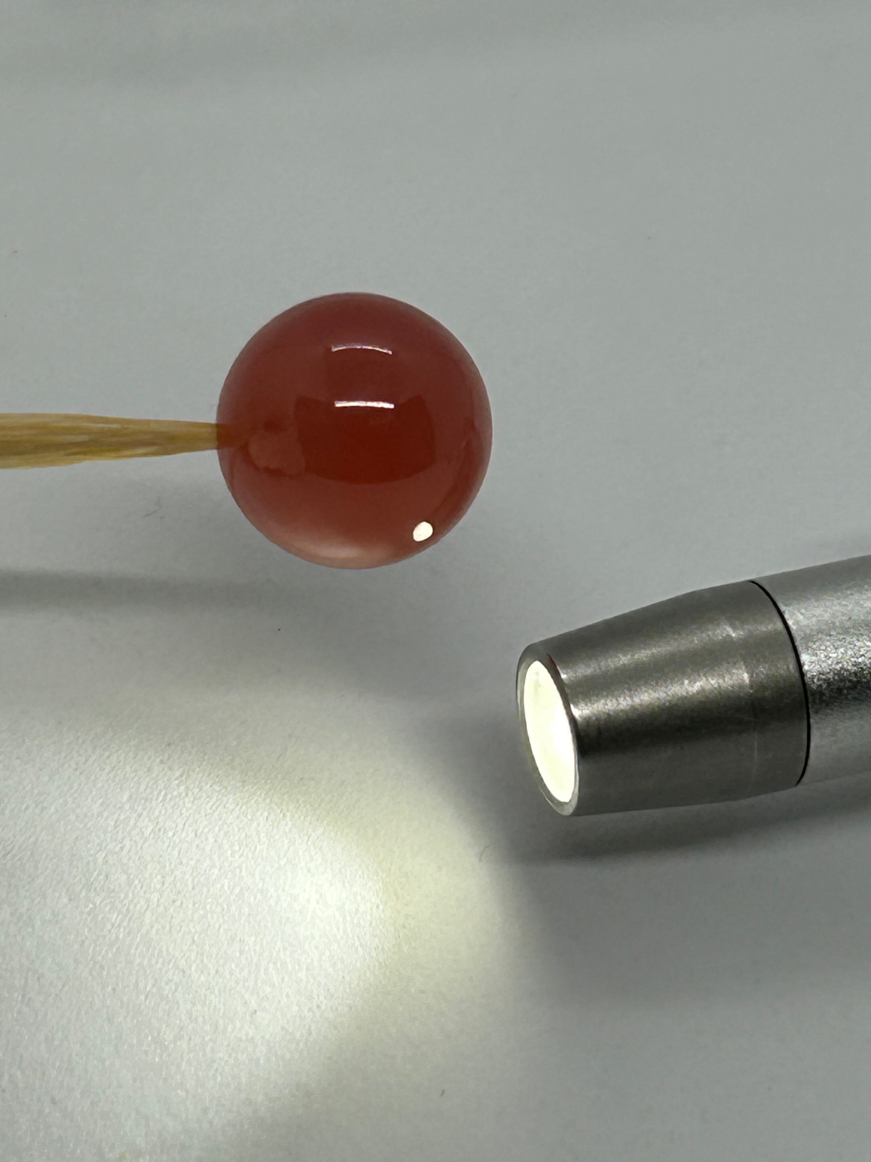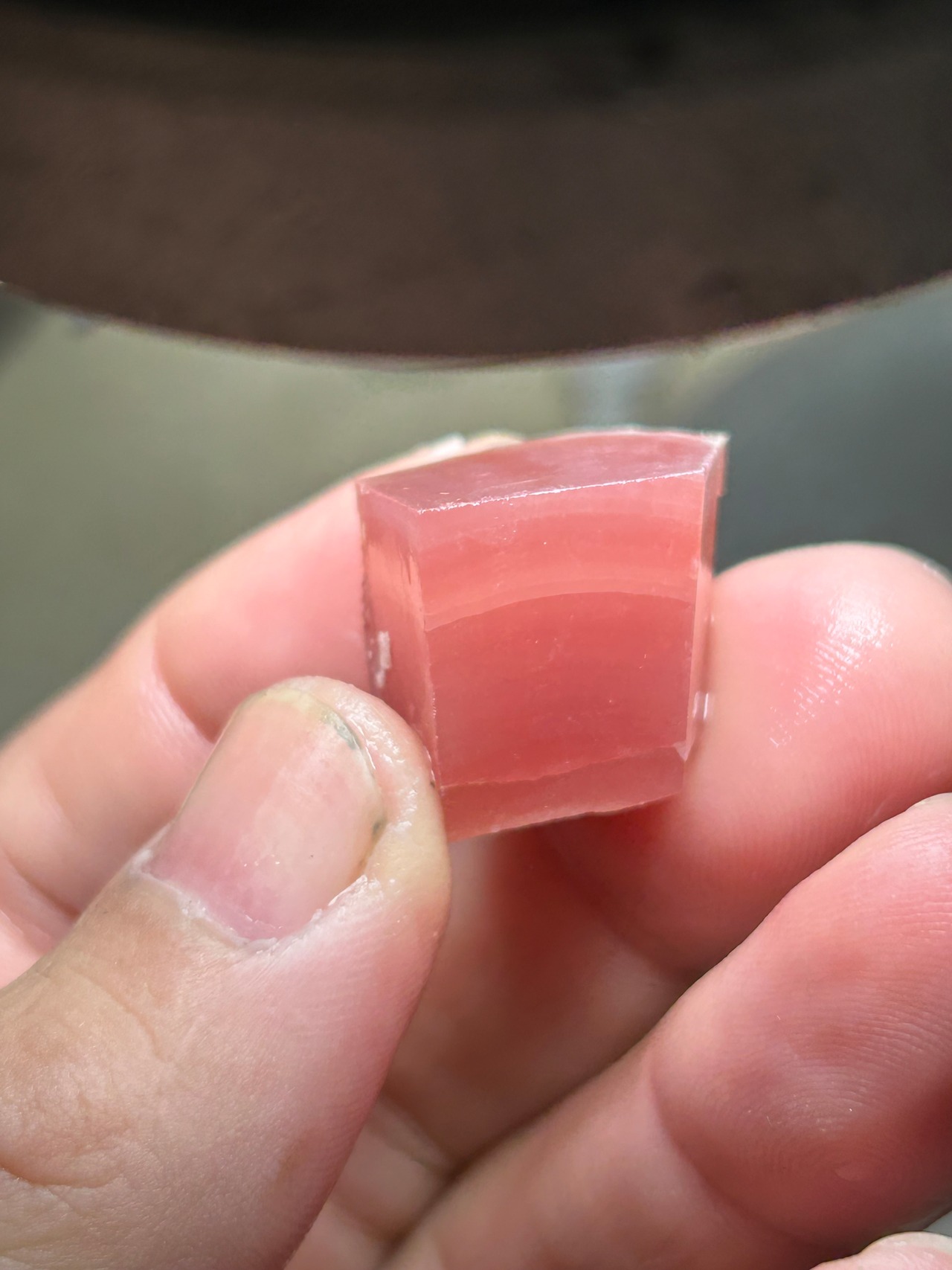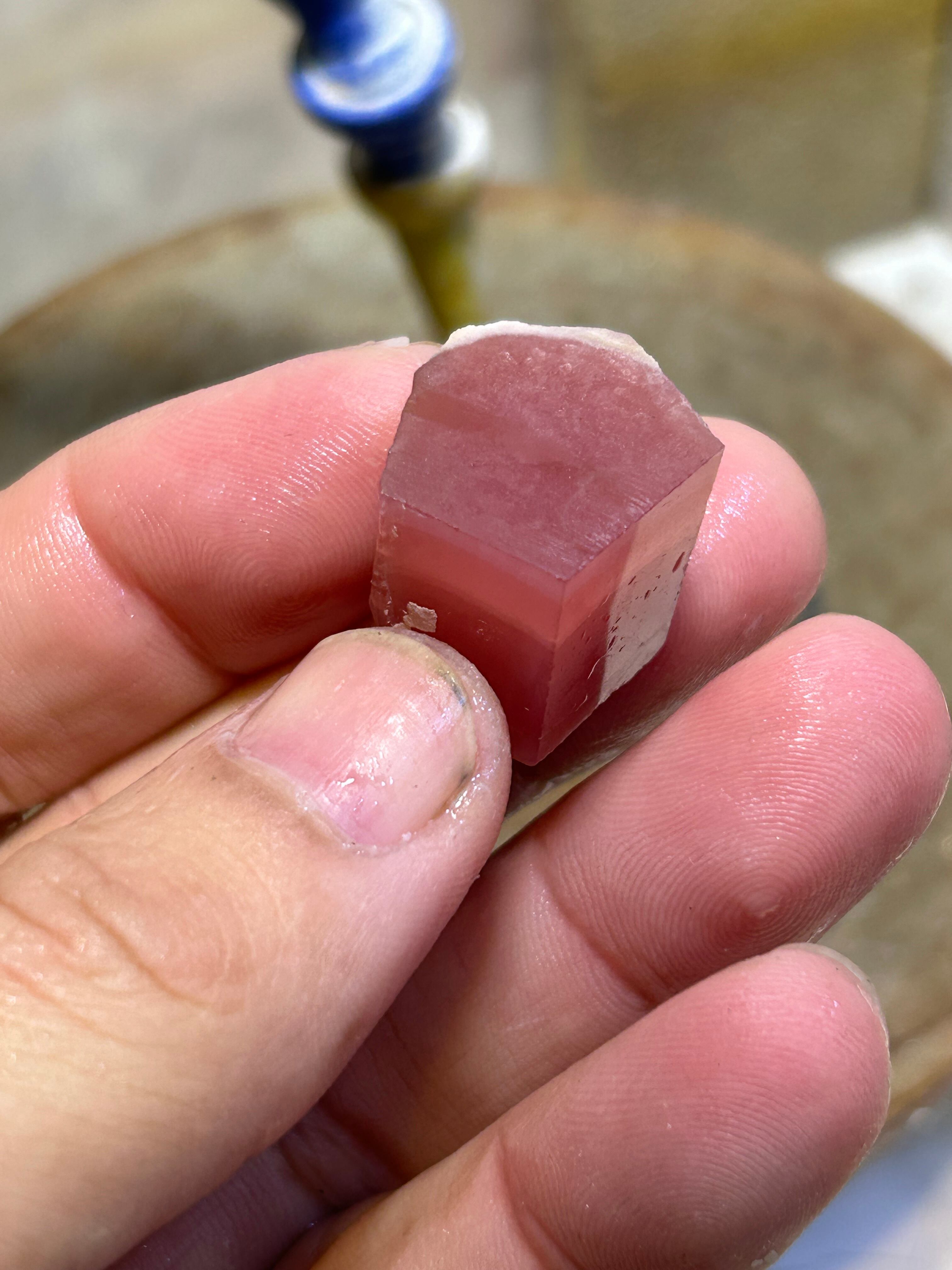北海道稲倉石鉱山のインカローズ(ロードクロサイト 菱マンガン鉱)を原石から加工して穴あき丸玉を作りました。
