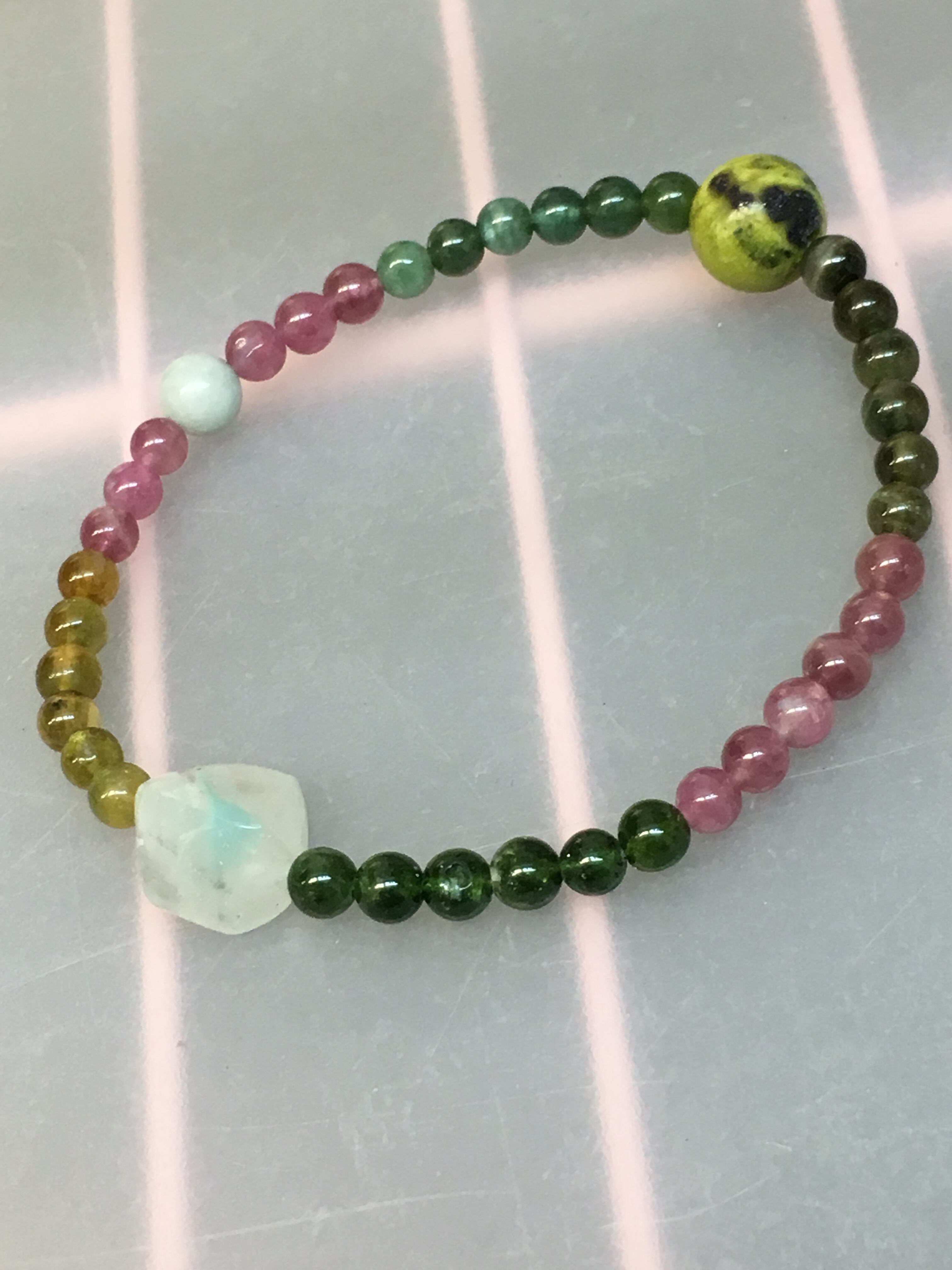 トルマリンと、アトランティサイト、糸魚川翡翠ののビーズと組み合わせました。