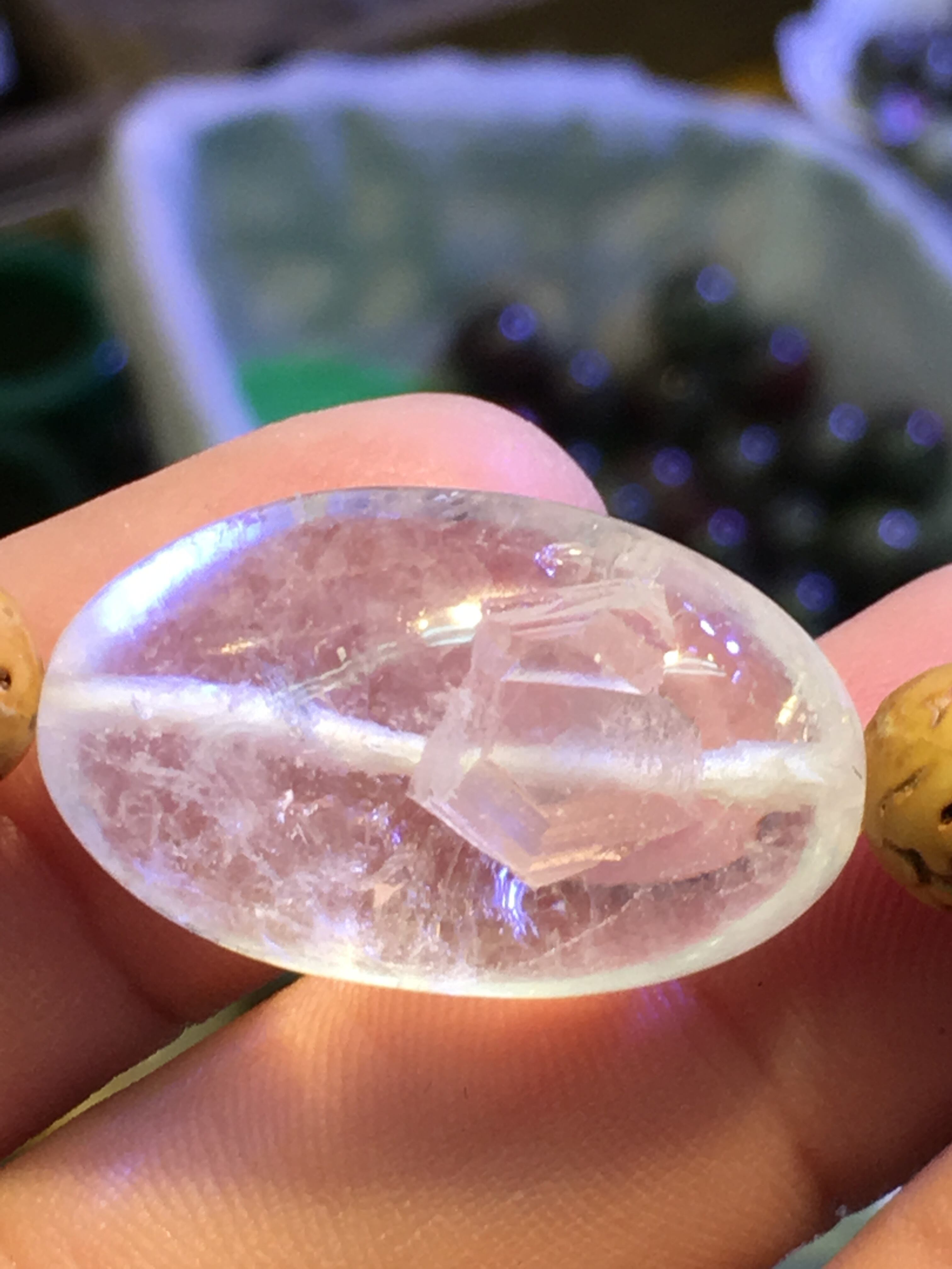 アパーチャ入の水晶をタンブルに研磨し、菩提樹のビーズと、アトランティサイトのビーズを組み合わせました。